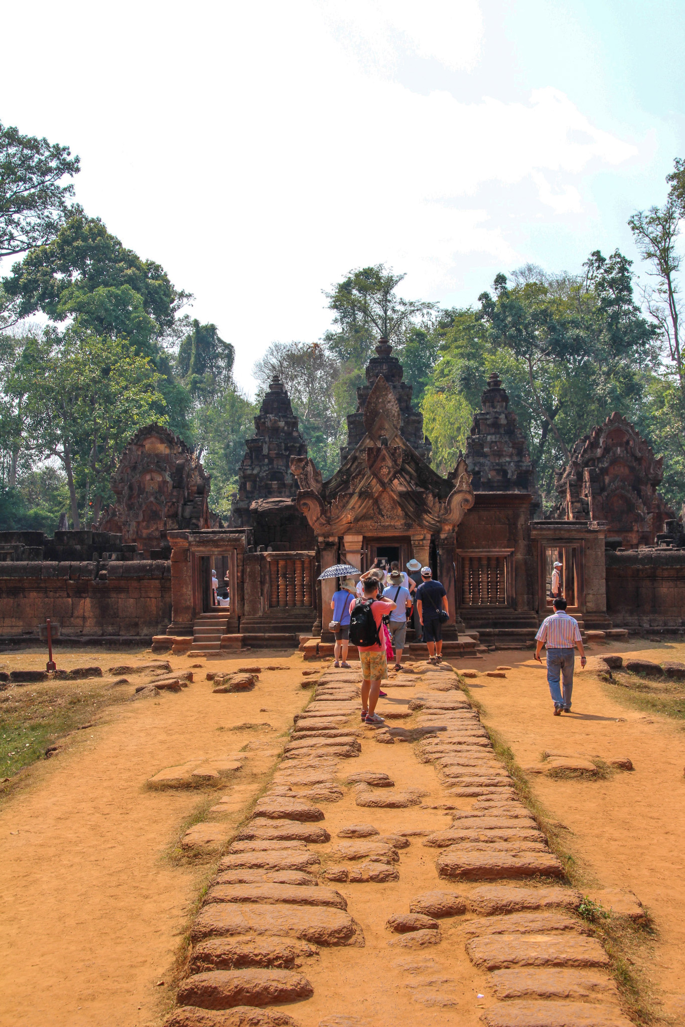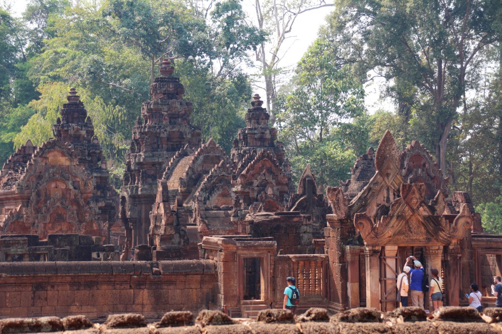 After exploring Angkor Wat, we visited a smaller temple called Banteay Srei Temple. It was built in 967 AD, roughly 150 years before Angkor Wat. Also known as the “Lady Temple,” due to the belief that the delicate carvings of female deities, that are found all over the temple, were crafted by women. Not only is this temple much smaller in overall size but the individual structures that make up the temple, are a lot smaller in scale compared to other temples in the area. It is built mainly with red sandstone which showcases intricate and detailed carvings on every piece. It is very different from any other temples I have seen and the combination of the rich colour of the sandstone with the detailed carvings offer a beautifully unique piece of art.