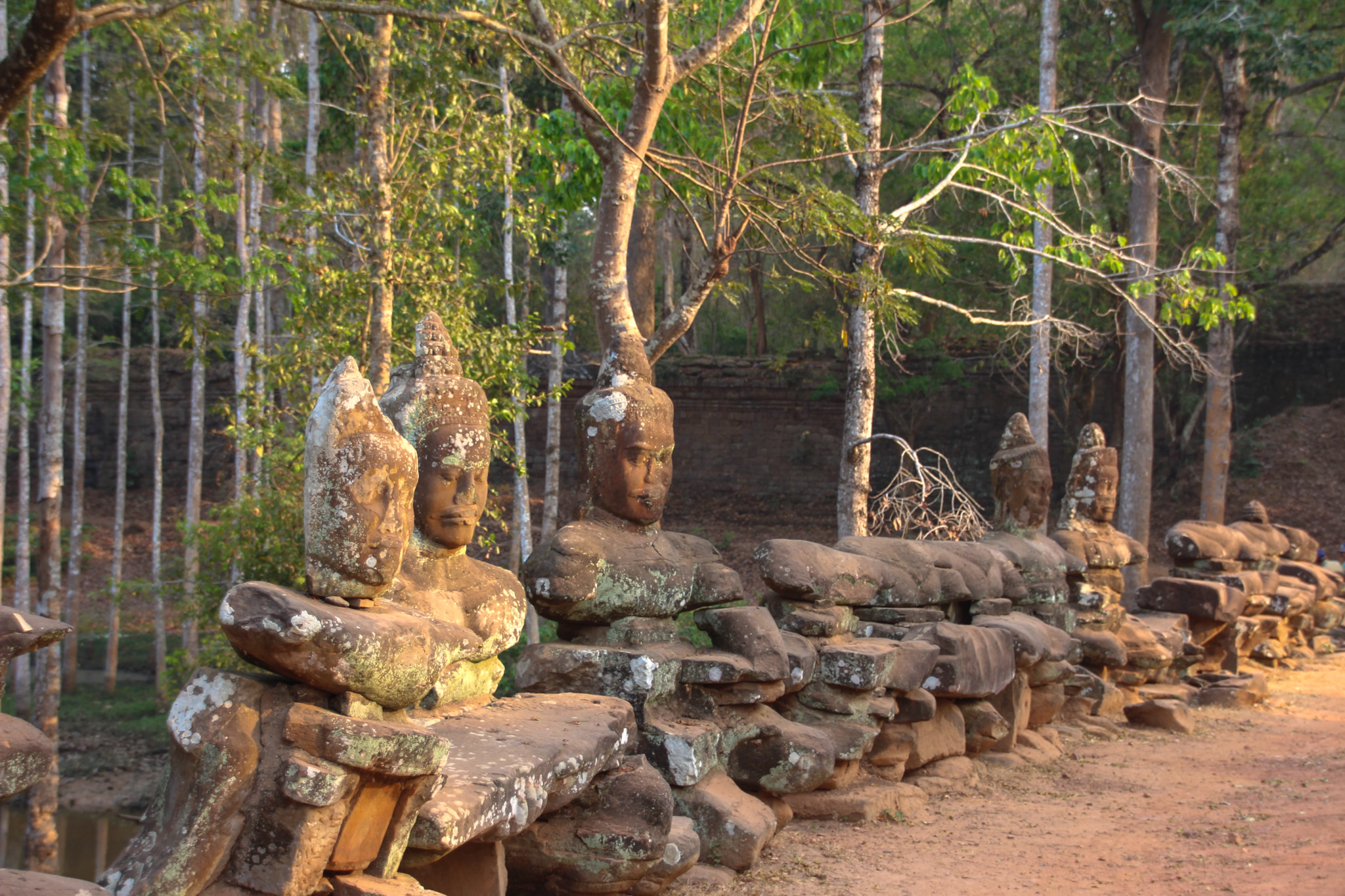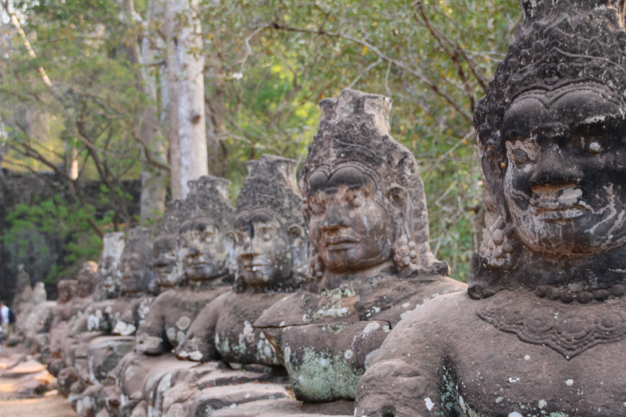 Angkor Thom was the last capital of the Khmer Empire which thrived in the late 12th century. The ancient city covers an area of ten square kilometres and is surrounded by a moat and a large wall with grand entrances on either side. We entered the walled city through the southern gate, Tonle Om Gate. As I walked towards the imposing gate, I was immediately drawn to the impressive statues that lined both sides of the causeway. On one side, there were 54 statues representing the gods, pulling the head of a serpent and on the other side of the causeway were another 54 statues that represent demons, who are pulling the tail of the serpent. In Hindu mythology, this depiction represents the ebb and flow of the ocean.