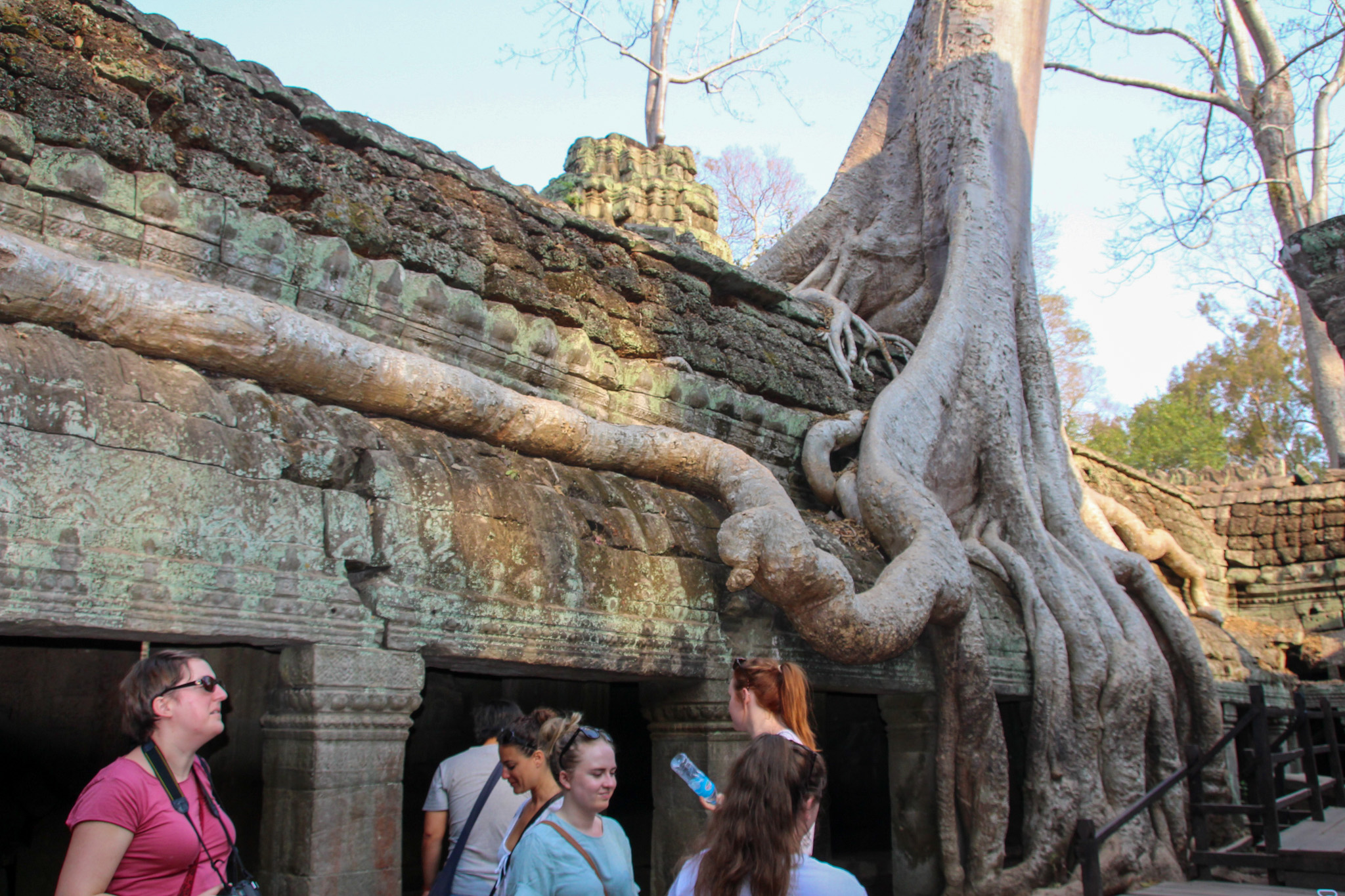 This has to be my favourite temple and not just because it is the Tomb Raider temple!! Ta Prohm is so unique and has so much character. Walking through the temple, dodging fallen stones on the path, climbing through doors that are shrouded with tree roots really made you feel like you were the one just discovering this archaeological site hidden in the jungle for the first time! This Bhuddist temple feels like it has been lost to the jungle, as its structure is engulfed with overgrown tree roots from the silk cotton tree and the strangler fig. The thick and thin roots twist around each other, and around the remaining ruins. I found it so interesting that the trees do not grow through the temple, rather they grow on top of the temple, with the roots cascading down around the walls of the temple as if it is swallowing it whole.
