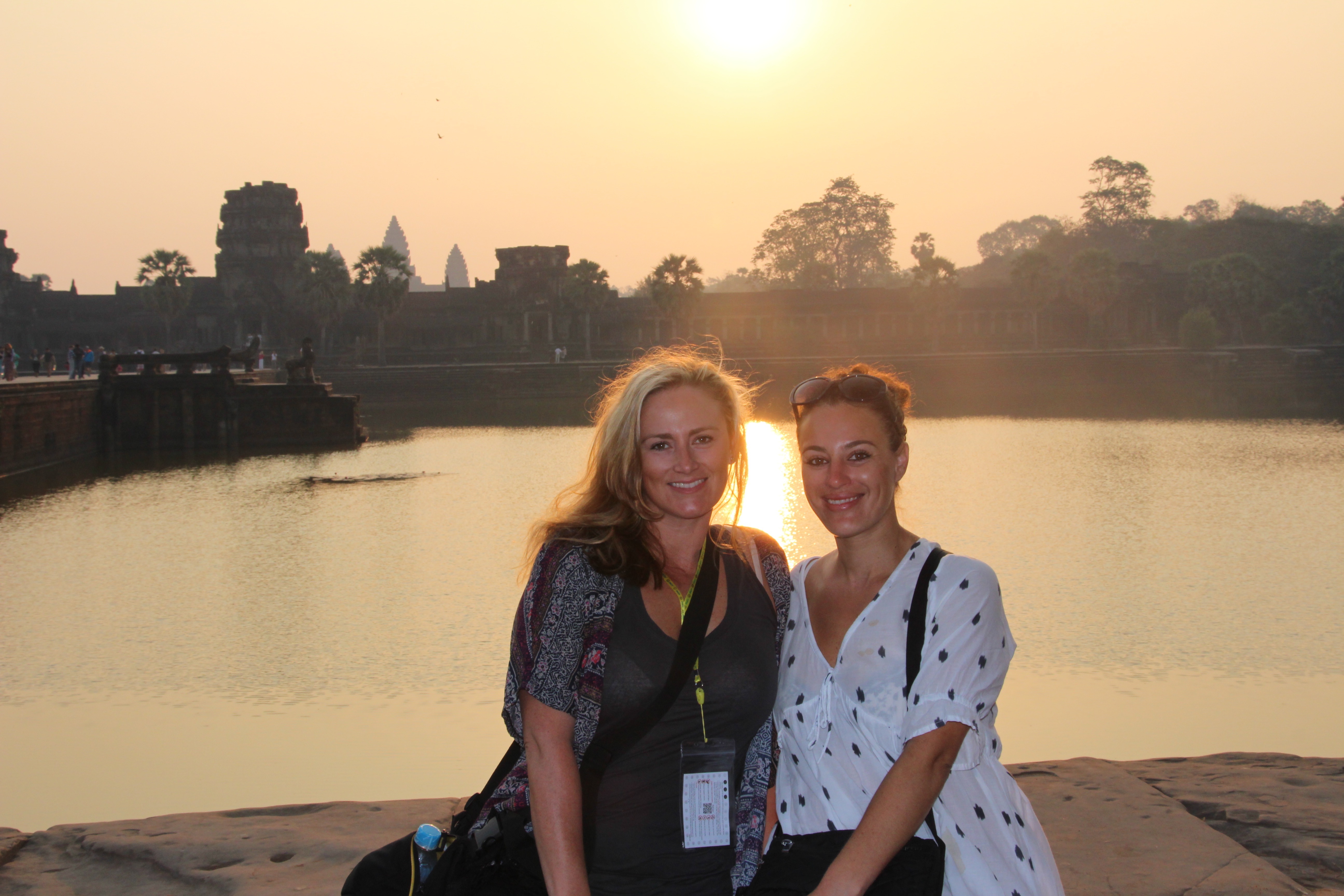 This morning we were up at 430 am to watch an unforgettable sunrise over Angkor Wat. What a magical experience this was! We arrived in the dark and surprisingly there was a calm peacefulness to the atmosphere considering the amount of people that were there. This made it hard to get a good position to witness the spectacle. We bought our much needed coffee, served with condensed milk, for $1 USD. It was served in a plastic cup, which was a little hot to hold, but it tasted delicious! And then we watched the magic happen and it was indescribable. As the sun rose, it cast a purple haze across the sky which slowly faded into a burnt orange backdrop, silhouetting the ancient temple and painting a perfect reflection on the still surface of the nearby ponds.