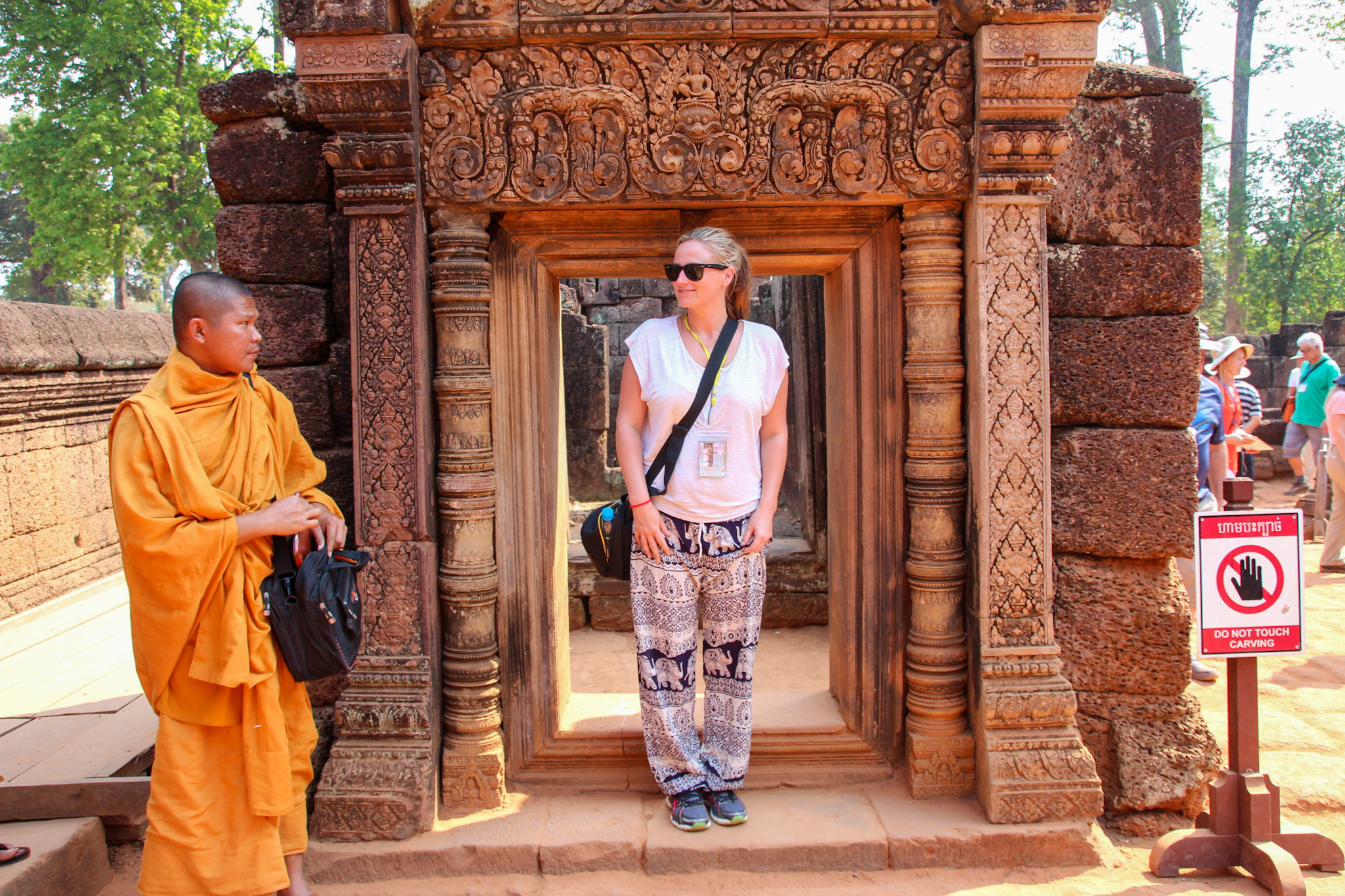 After exploring the main attraction we visited the smaller “lady temple,” called Banteay Srei Temple. This temple offers a dramatic contrast to Angkor Wat, not only in its much smaller size but in its unique architectural features. It features red sandstone that is covered in delicate and detailed carvings.