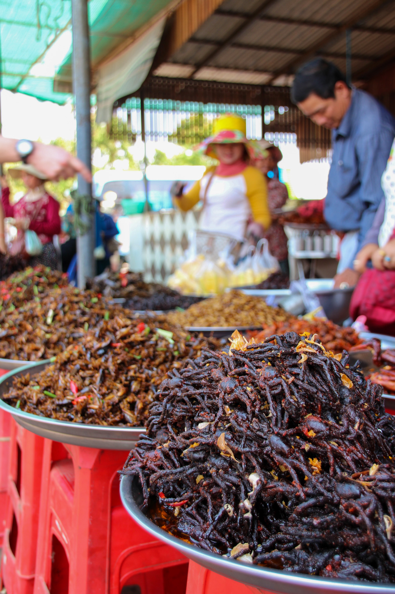 Once we returned to the homestay for breakfast before starting the journey to Phnom Penh. The drive took just under a 4 hours. For one of the other travelers, Ian, this would have felt like the longest drive as he was suffering from food poisoning. We stopped on the way at a place called Spider Town. We wandered around the markets which were filled with insects of all kinds, scorpions, spiders, grasshoppers and cockroaches. Everything that you wouldn’t want to eat was available for purchase! They even had buckets of live tarantulas that you could buy as a pet. Our guide told us that the tarantulas had their fangs removed so you would not get bitten. This is where I tried a deep fried tarantula!! It was extremely oily and very hairy! I first tried the legs, which just tasted like bland potato chips. I then found the courage to bite into the abdomen, which was really gross! It had eggs in it so the texture and thought of what I was eating turned me off to the point I could not stop gagging! I then tried a roasted grass hopper, which was crispy and quite tasty. We bought some pineapple from the local kids to help cleanse the palate and wash away any remnants of insect. This did cause a bit of a problem, all of a sudden many more kids surrounded us and would not leave us alone. They continuously hounded us wanting us to buy more from them.